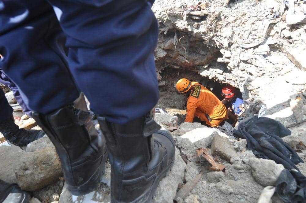 1. Petugas berupaya mengevakuasi jenazah korban bencana gempa dan likuefaksi yang ditemukan di reruntuhan bangunan di Kelurahan Balaroa, Palu pada Rabu (30/10), demikian dikutip dari Antara Foto