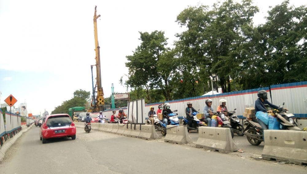 2. Kendaraan melintas di sela pengerjaan proyek tol layang. Setidaknya tiga jalur jalan ditutup selama masa pengerjaan