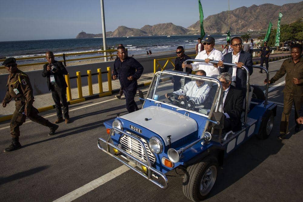 7. Menteri PUPR Basuki Hadimuljono, mantan Presiden Timor Leste Jose Ramos Horta, Menlu Timor Leste Dionisio Babo Soares, dan President of the Assembly of the Republic Portugal Eduardo Ferro Rodrigues menjajal Jembatan dan Taman BJ Habibie dengan menaiki mobil